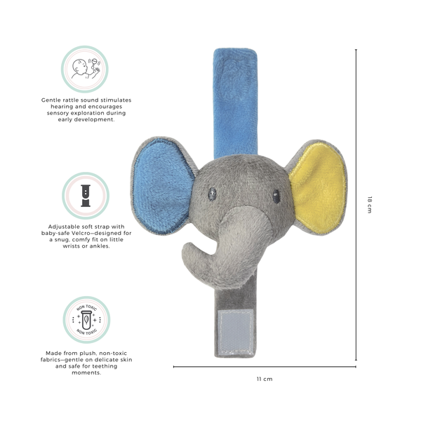 Discover a playful way to engage your baby’s senses with our adorable animal wrist rattles. Featuring cheerful characters like elephants, pandas, penguins, and more, these ultra-soft rattles wrap gently around your baby’s wrists with an easy Velcro closure. As your little one moves, the wrist rattle produces a soft jingle, encouraging sensory development, hand-eye coordination, and auditory awareness. Made from plush, baby-safe fabric in a variety of eye-catching colors, these rattles stay securely in place — perfect for playtime at home or on the go. Whether given as a newborn toy or included in a baby shower hamper, these wrist rattles are a joyful first accessory for early learning and giggles.