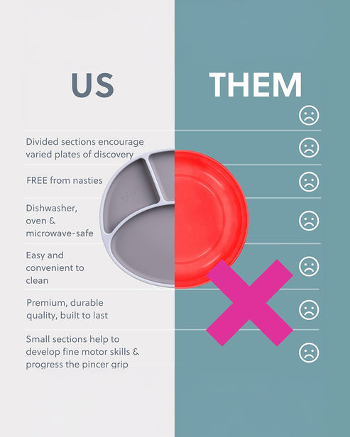 The Silicone Suction Divider Plate supports cutlery control and independent feeding by encouraging exploration of different tastes and textures. With a secure suction base and multi-section design, it helps little ones practice scooping and scraping while promoting balanced, varied meals. Ideal for baby-led weaning and transitioning to full meals.