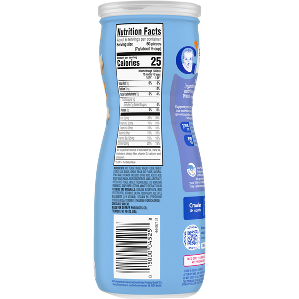 INGREDIENTS: RICE FLOUR, WHOLE WHEAT FLOUR, WHEAT STARCH, CANE SUGAR, WHOLE GRAIN OAT FLOUR, NATURAL PEACH VANILLA FLAVOR (INCLUDES CITRIC ACID, ACETIC ACID, INVERT SUGAR, PEACH JUICE CONCENTRATE, VANILLA EXTRACT), DRIED APPLE PUREE, MIXED TOCOPHEROLS (TO MAINTAIN FRESHNESS), SUNFLOWER LECITHIN, ANNATTO EXTRACT COLOR,