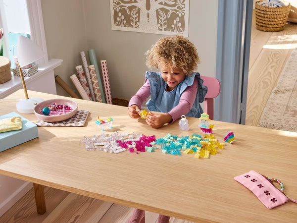 Kids begin by building heart, ghost, mermaid, star and unicorn toys. As their building confidence grows, they move onto a spaceship, cloud, shooting star, bird, narwhal, ice cream and flower. Next, they can scale up the creative fun with a large castle and dragon toy. Translucent bricks, eye and mouth pieces and hanger-bricks for display add see-through sparkle and extra creative fun to kids’ creations.