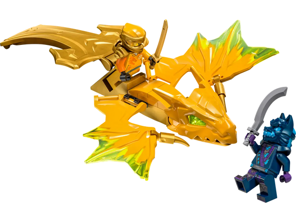 - Ninja action toy – Kids can place Rising Dragon Arin on the back of the yellow dragon toy, slam down its golden tail and launch them both into the air
