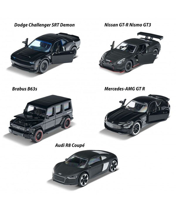 - The cool road vehicles with Die-Cast body in different shades of black come with freewheel and suspension and in original license from Audi, Brabus, Nissan, Dodge and Mercedes-AMG