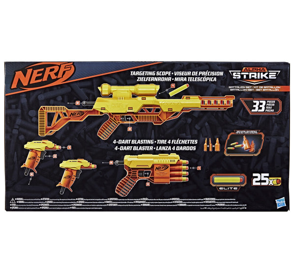 33-piece Battalion Set: Get a NERF game going with this 33-piece set that includes 2 Stinger SD-1 blasters, 1 Wolf LR-1 blaster, 1 Fang QS-4 blaster, 4 half-targets, and 25 darts .