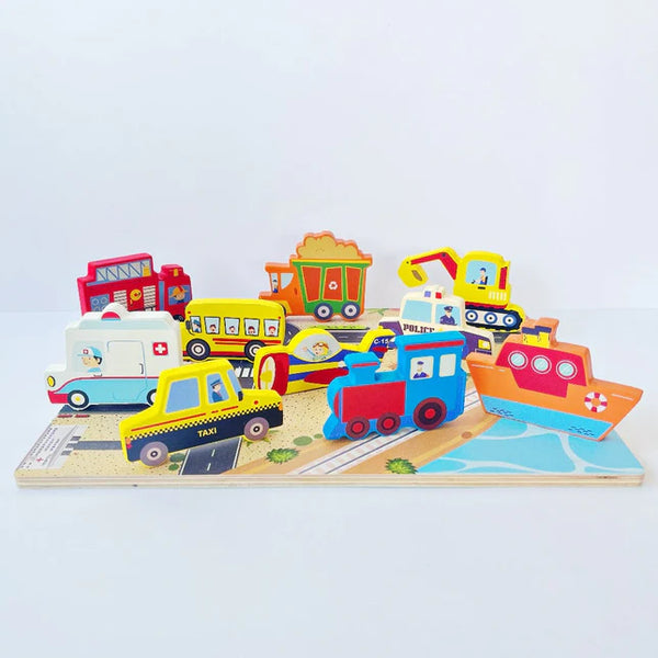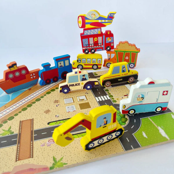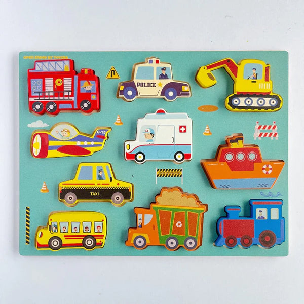 - Our Chunky Wooden Vehicles Puzzle is more than just a toy—it's a learning aid that cultivates essential skills. From enhancing hand-eye coordination and fine motor skills to encouraging imaginative and independent play, as well as language development, memory, and concentration, this puzzle offers a holistic learning experience.