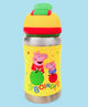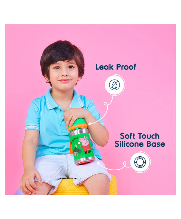 The Rabitat Sports Stainless Steel Bottle Peppa Pig edition is one of the cutest bottles available in different vibrant colours. The bottle is perfect for quick sips to hydrate your kids who have a sporty spirit and never get tired of running around. The dome -shaped cap opens with one click and makes the bottle spill-free as it closes. The bottle also has a soft & flexible silicone spout that is gentle on gums and gets tucked under the cap keeping it hygienic, protected from dirt & germs. The wide -mouth design makes cleaning super easy. It also comes with a silicon grip & a silicone strap making it easy to carry everywhere as your kids find new adventures every day or start their school. It also comes in 2 more Peppa Pig designs that are fun and attractive