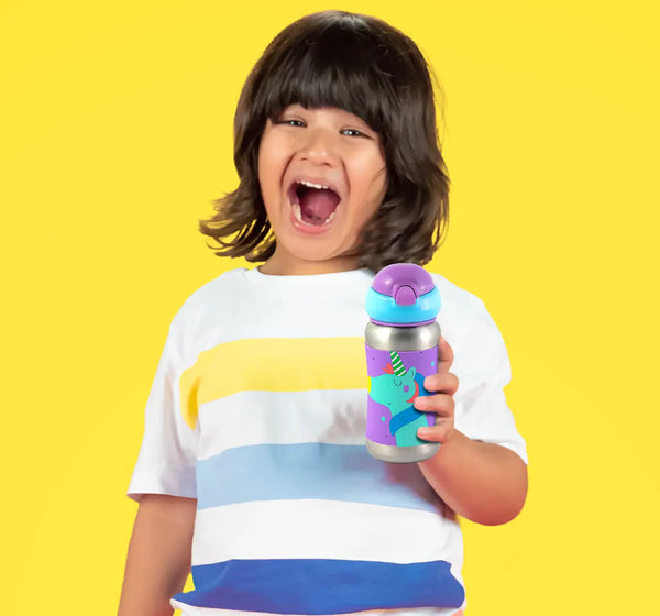 The Rabitat Steel Play Bottle is one of the cutest bottles with fun Amazonia characters in vibrant colours. The bottle is perfect for quick sips to hydrate your kids who got a sporty spirit and never get tired of running around. The dome-shaped cap opens with one click and makes the bottle spill-free as it closes. The bottle also has a soft & flexible silicone spout that is gentle on gums and gets tucked under the cap keeping it hygienic, protected from dirt & germs. The wide-mouth design makes cleaning super easy. It also comes with a silicon grip & a silicone strap making it easy to carry everywhere as your kids find new adventures every day or start their school.